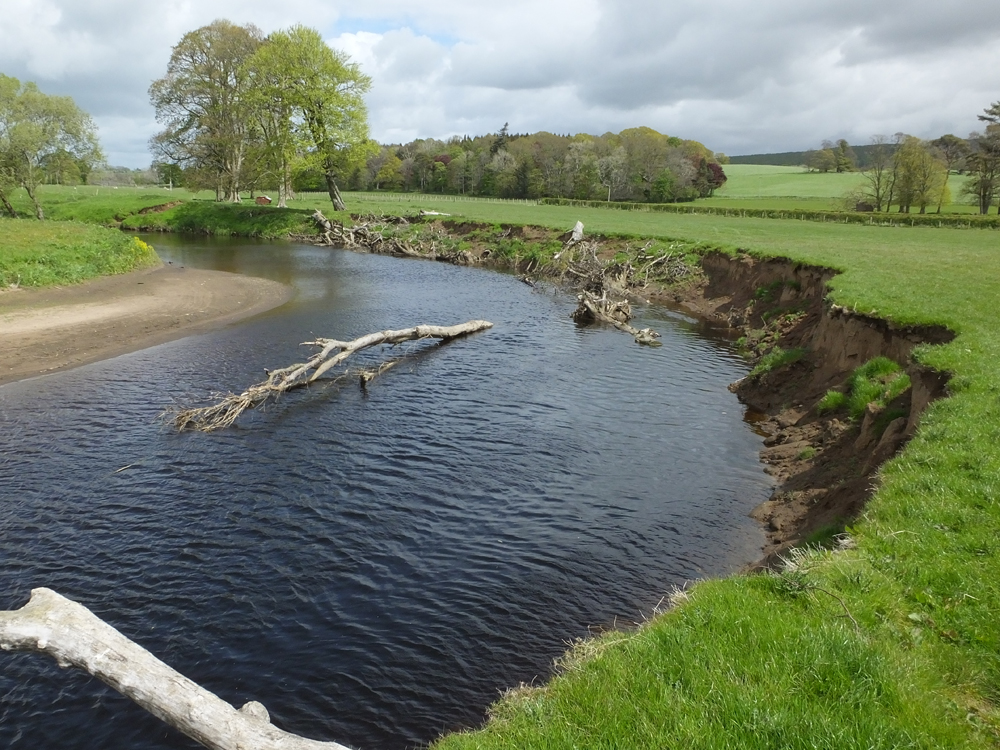 The second major erosion point is illustrated below. A different approach was used to address this erosion and a contractor was employed to place large woody debris at the toe of the bank. This work has brought a degree of success however it hasn’t gone far enough and needs more timber added towards the lower end of the bend. Some of the timber is sitting above the waterline and would have been better in the river at the toe of the bank but I think it was placed this way as there was no obvious way to anchor it in place. A limited amount of re profiling has been attempted and the bank should be more erosion resistant at the upper end. Several of the placed trees have been dislodged by winter spates an can be seen mid stream. These would be better winched back to the bank and secured in place, perhaps by wiring them to other logs that are in place (a relatively inexpensive procedure).