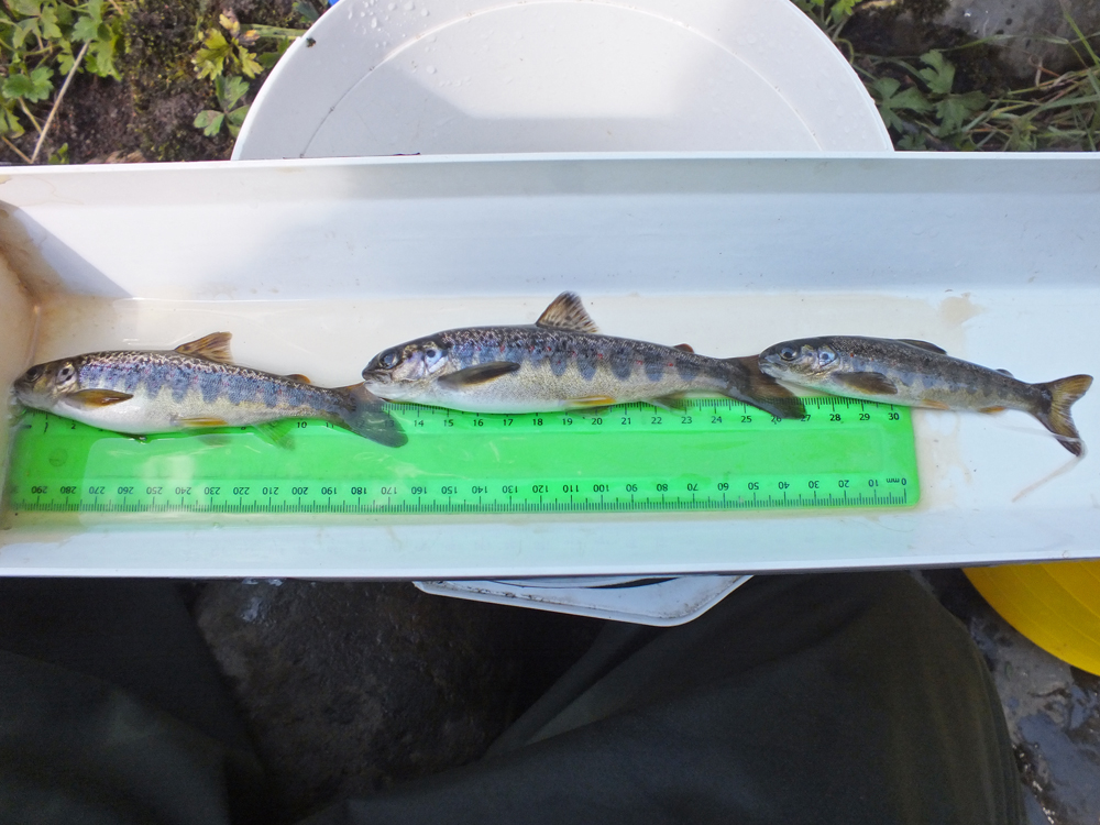 We had planned to fish another site somewhere downstream of the weir on the way back to the van to see if salmon were present below but as we now knew they managed to reach further upstream, we changed our plans and will add an extra site into the upper survey tomorrow if the weather permits. We couldn’t not have a quick look below the weir to see if there were more salmon there but after a very quick run through a few likely spots, we found only one parr and a few trout. Again the habitat isn’t ideal for spawning but at least fish are managing.