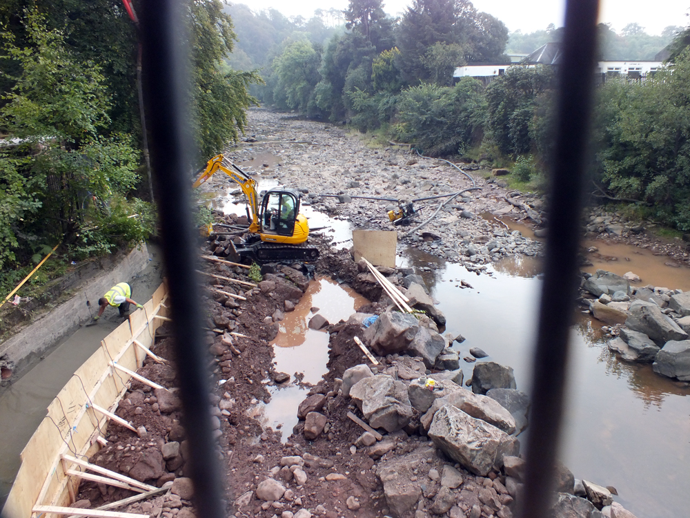 First to avoid confusion, there are two separate jobs underway at Catrine, the large weir contract that has progressed throughout the summer. Second contract is the Daldorch wall underpinning. The contractors are different as are the organisations responsible for the works.