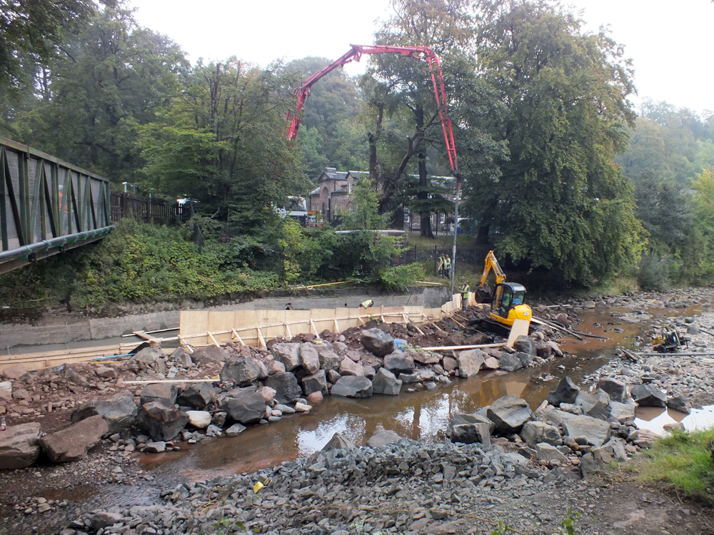 The second job underway at Catrine is the underpinning of the Daldorch wall. The shuttering was originally fixed a few weeks ago but was lost in a spate before the concrete was poured. We arrived at the site to see a pump waiting to start work. The shuttering was being strengthened with extra supports. We left with fingers crossed that the framework would hold.